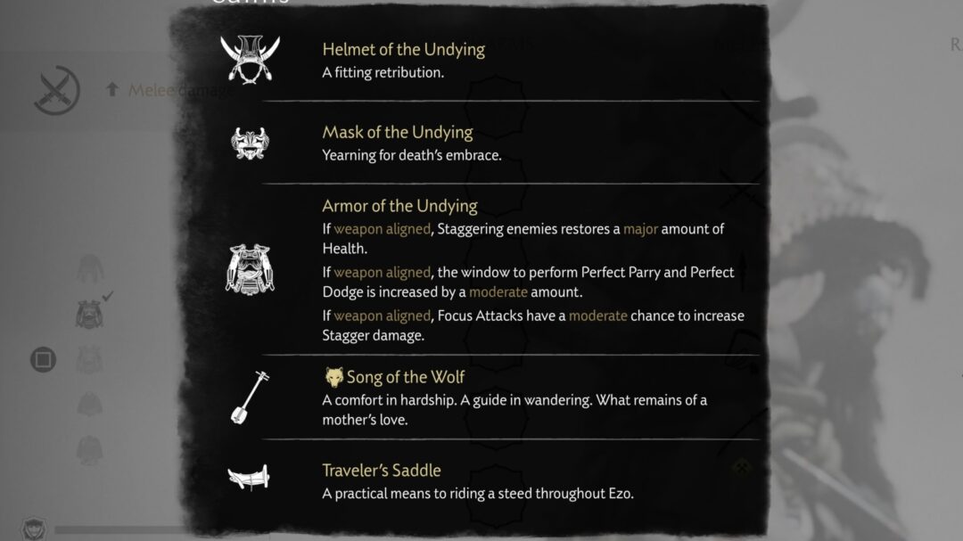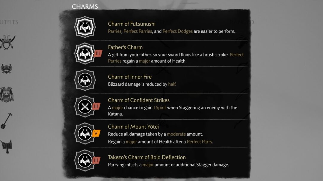 | Charm of Mount Yotei | Solve your first Mountain Reliquary puzzle. | Reduce all damage taken. Regain Health after a Perfect Parry. |